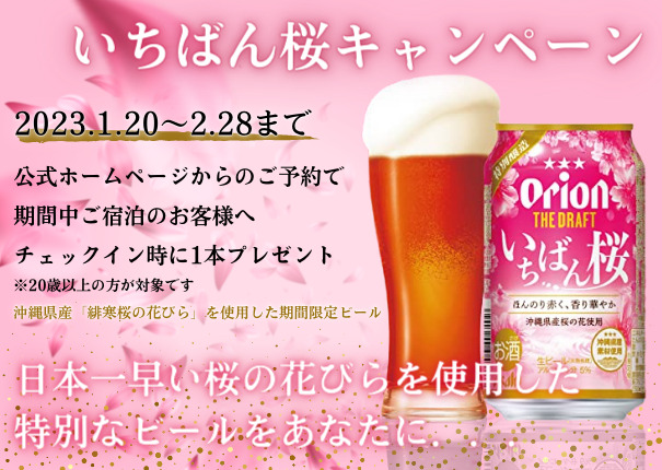 キャンペーン期間中、公式サイトからのご予約で期間中にご宿泊頂いたお客様にはもれなく!「オリオンドラフトいちばん桜」をプレゼント♪
