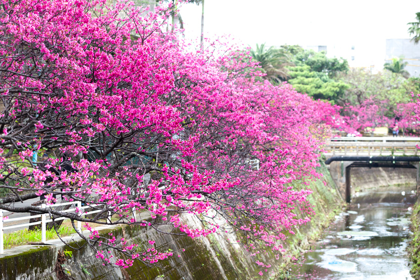 与儀公園には約400本の緋寒桜の木が植えられており、川沿いの桜並木が満開になった風景が見られます。