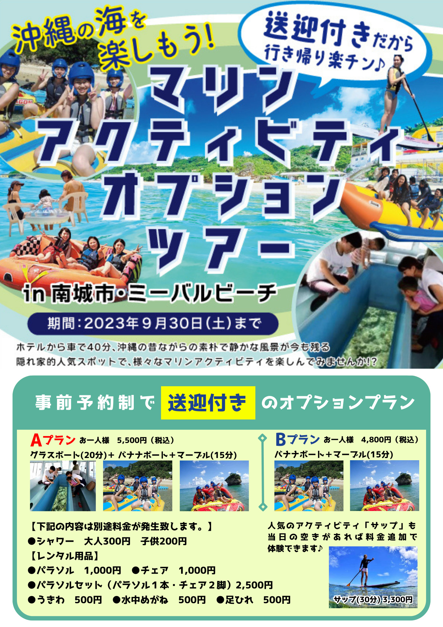 ご宿泊南城市玉城にあるみーばるマリンセンターとのコラボ企画になります。リゾート開発とは無縁の沖縄の素朴な風景が残る隠れ家的人気スポットにて様々なマリンアクティビティを楽しんで頂きます。