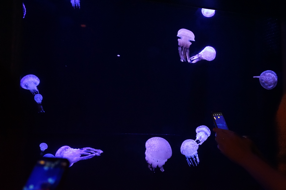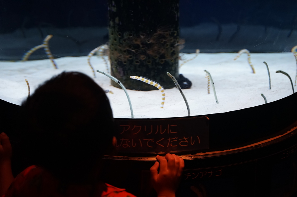 しばらく深海の雰囲気で暗がりを進むと、くらげやチンアナゴがわかいいですね。