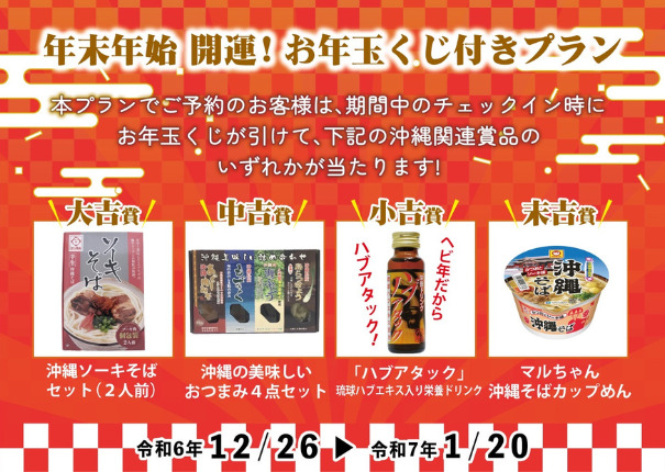 プランでご予約のお客様に、チェックイン時にお年玉くじを引いてもらい、下記の沖縄関連商品のいずれかが当たるお得なプランとなっております。