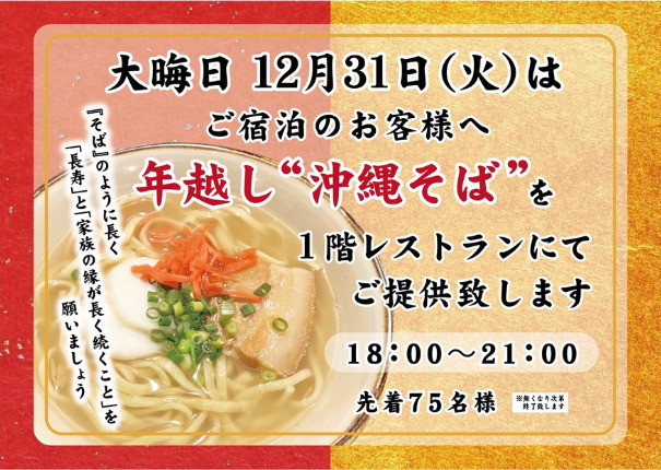 大晦日ご宿泊のお客様、先着75名様限定で「沖縄そば」をご用意いたします。