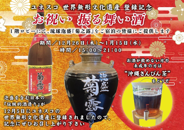 ロビーにて泡盛・菊之露(きくのつゆ)をご堪能下さいませ。