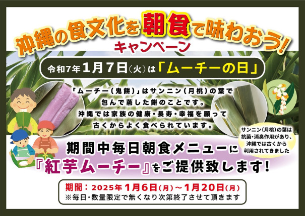2025年1月7日(火)はムーチーの日です。沖縄GRGホテルズではムーチーの日に合わせて、数量限定でご朝食のお客様に提供いたします。沖縄の食文化を是非味わってみて下さい。